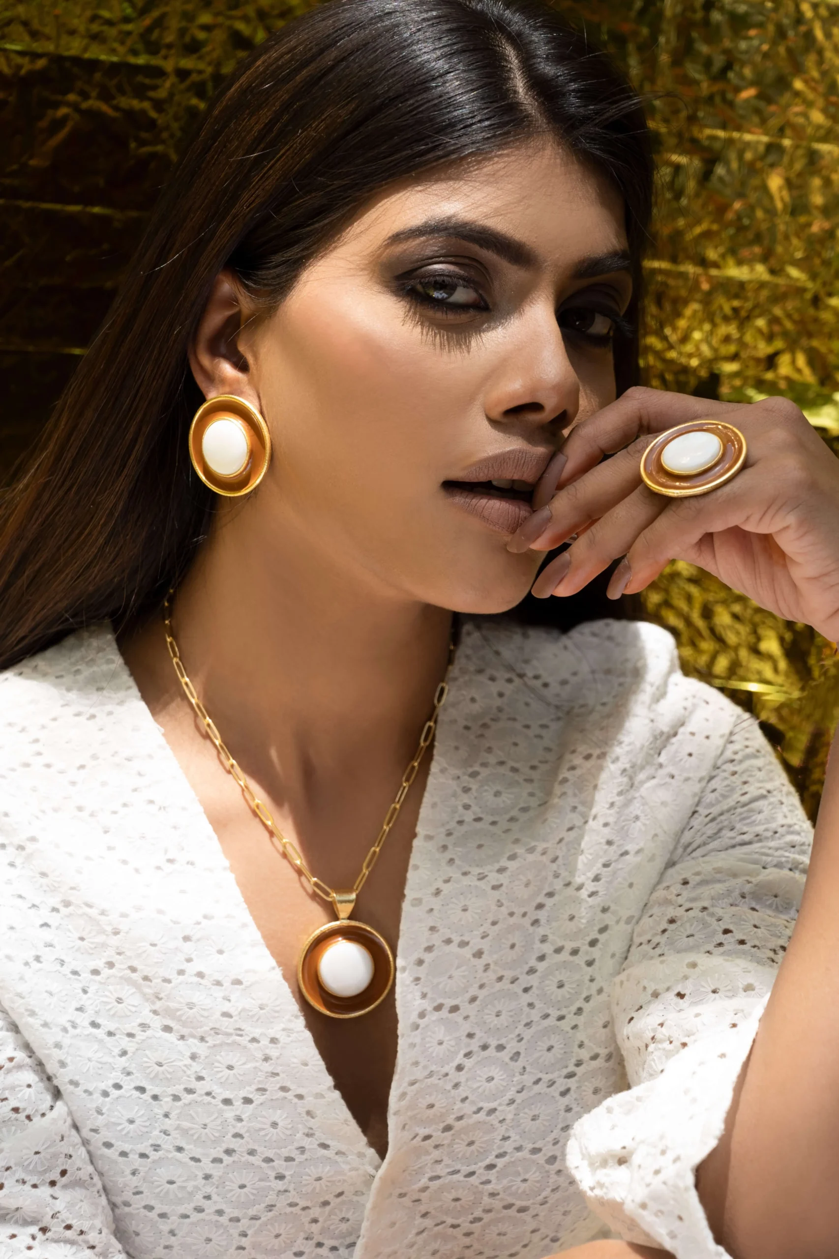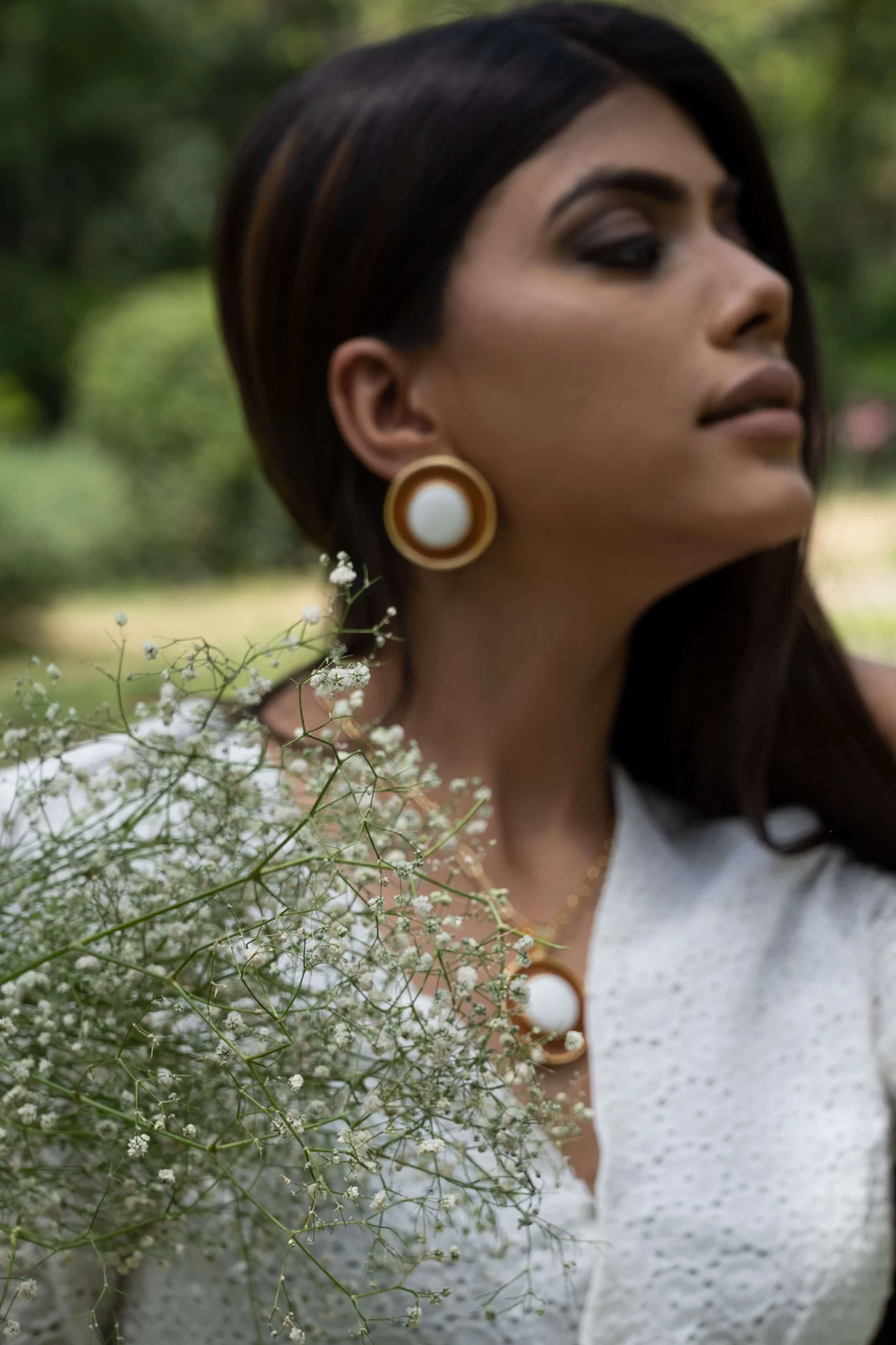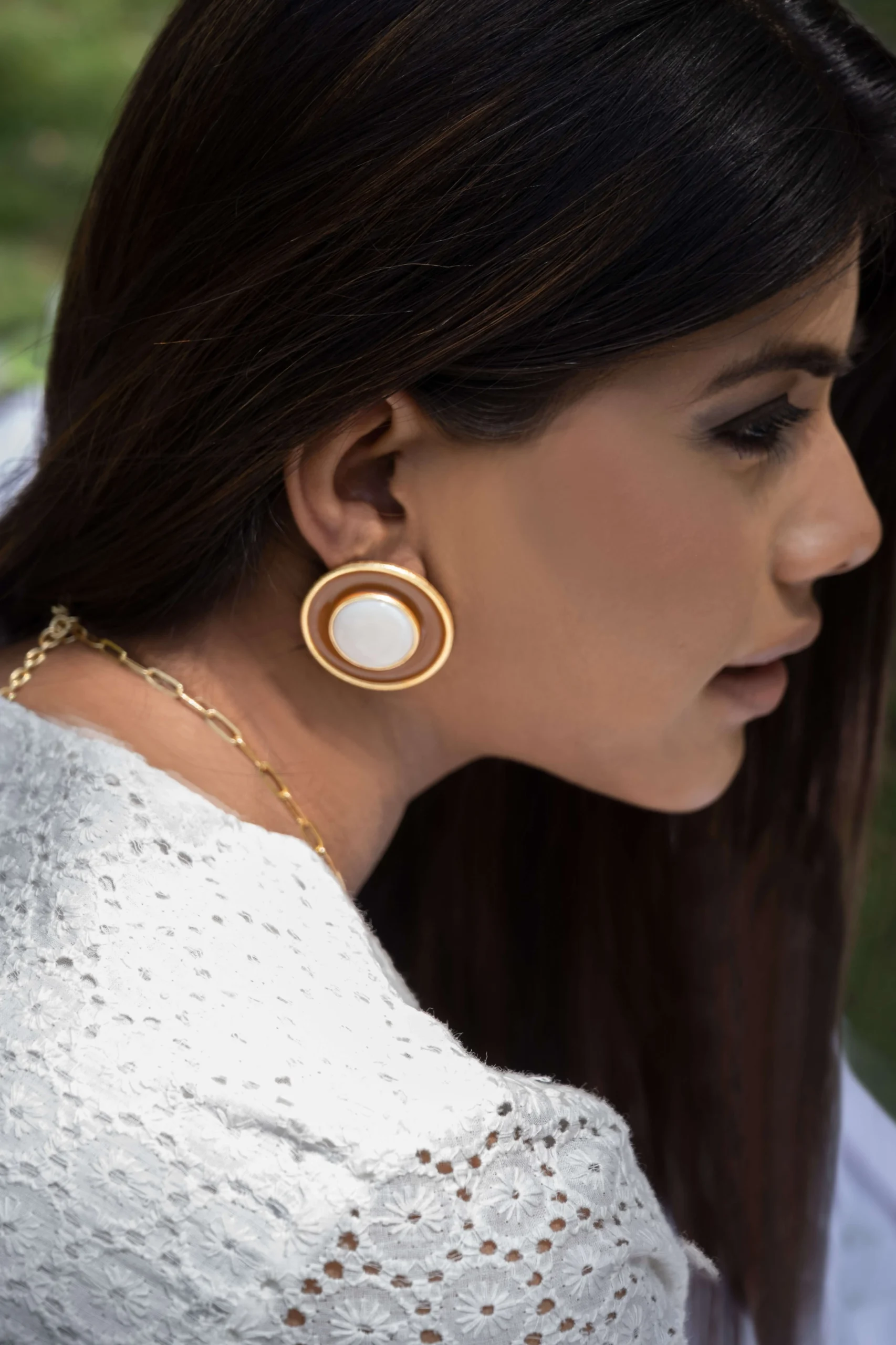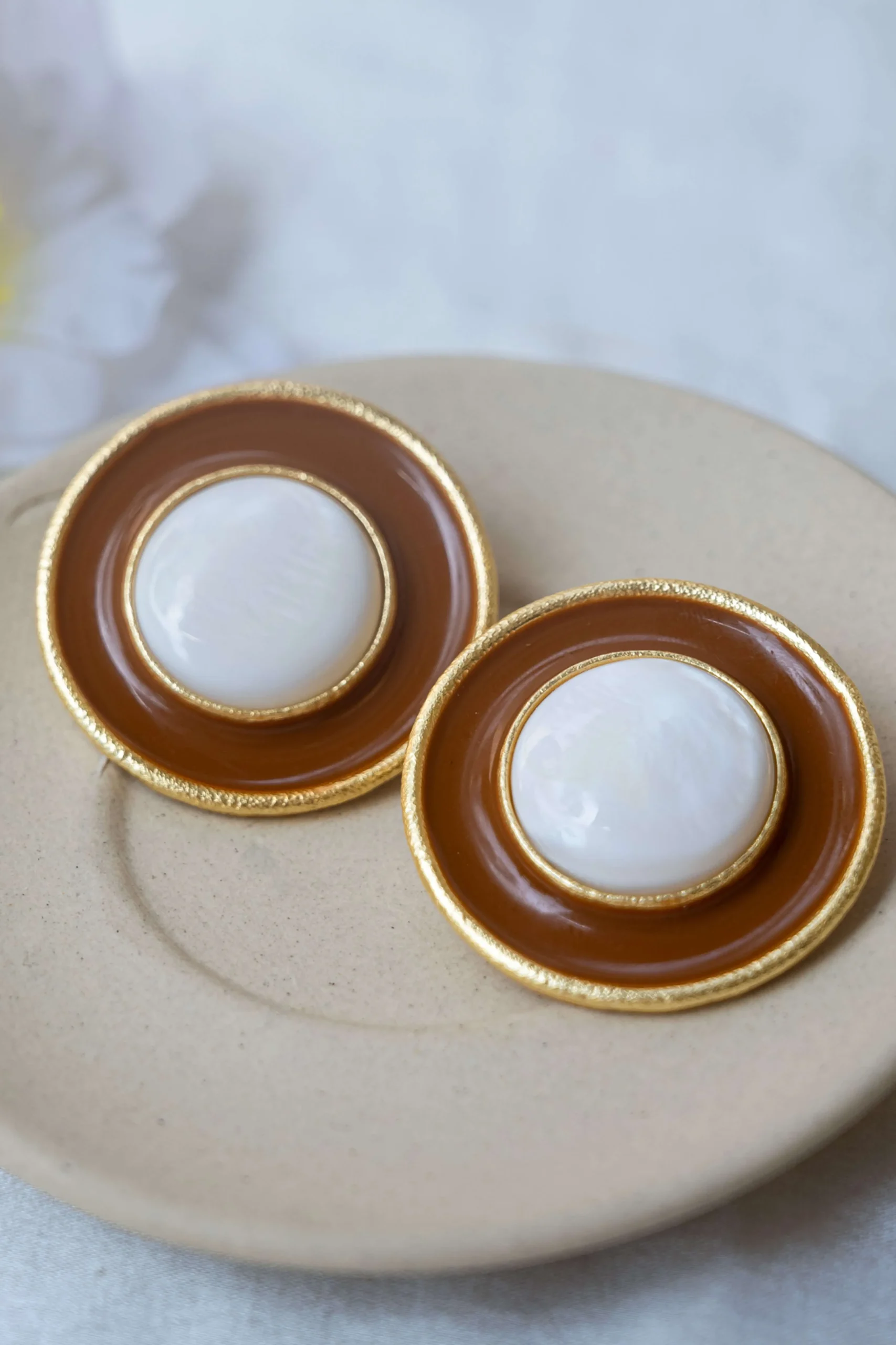 These Mother of pearl earrings with a statement look and dark brown enamel inspired by Art Deco era are a unique and striking accessory that will elevate any outfit. The mother of pearl’s iridescent sheen adds a touch of elegance and sophistication, while the dark brown enamel creates a bold contrast and geometric pattern.
