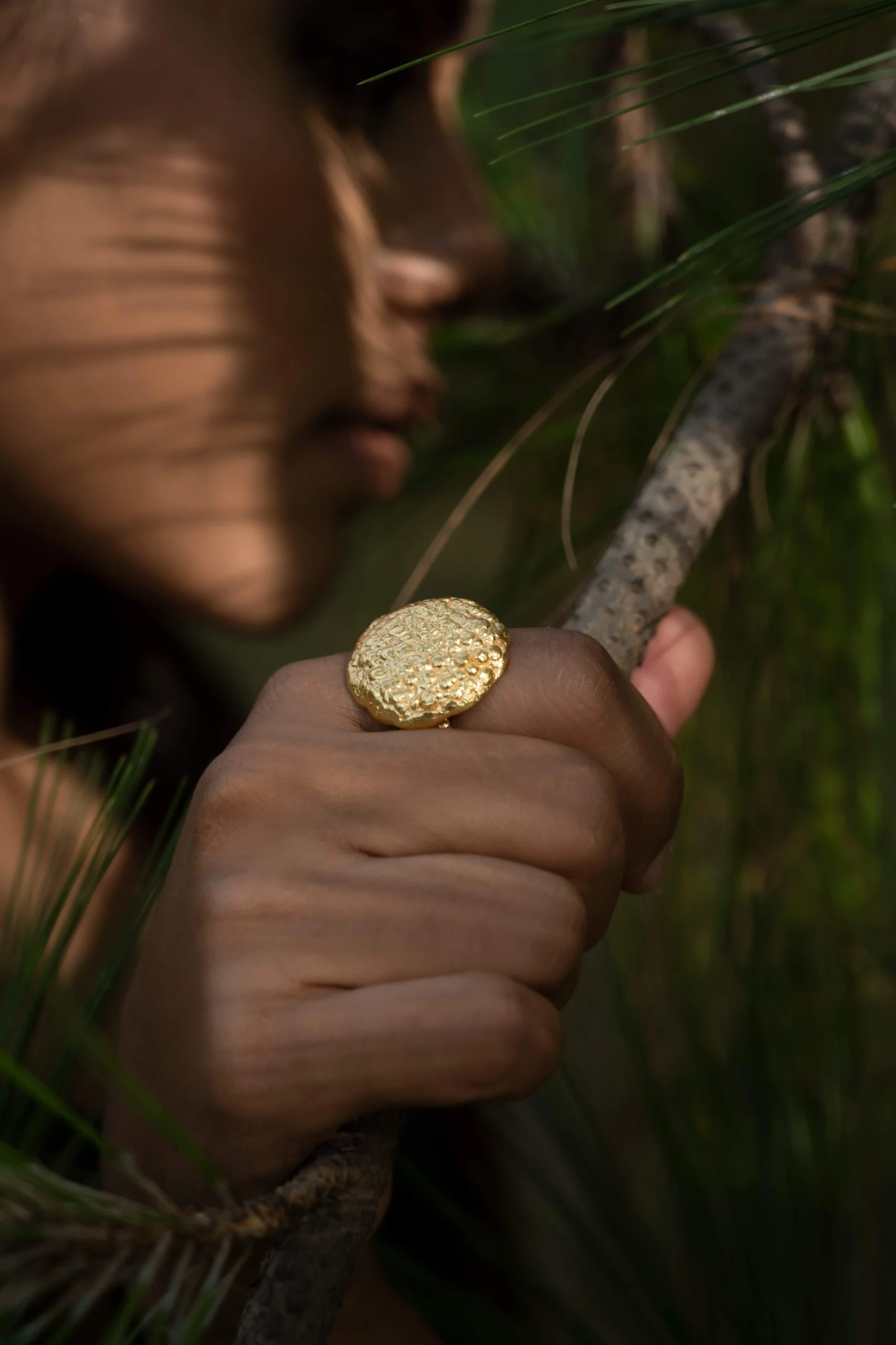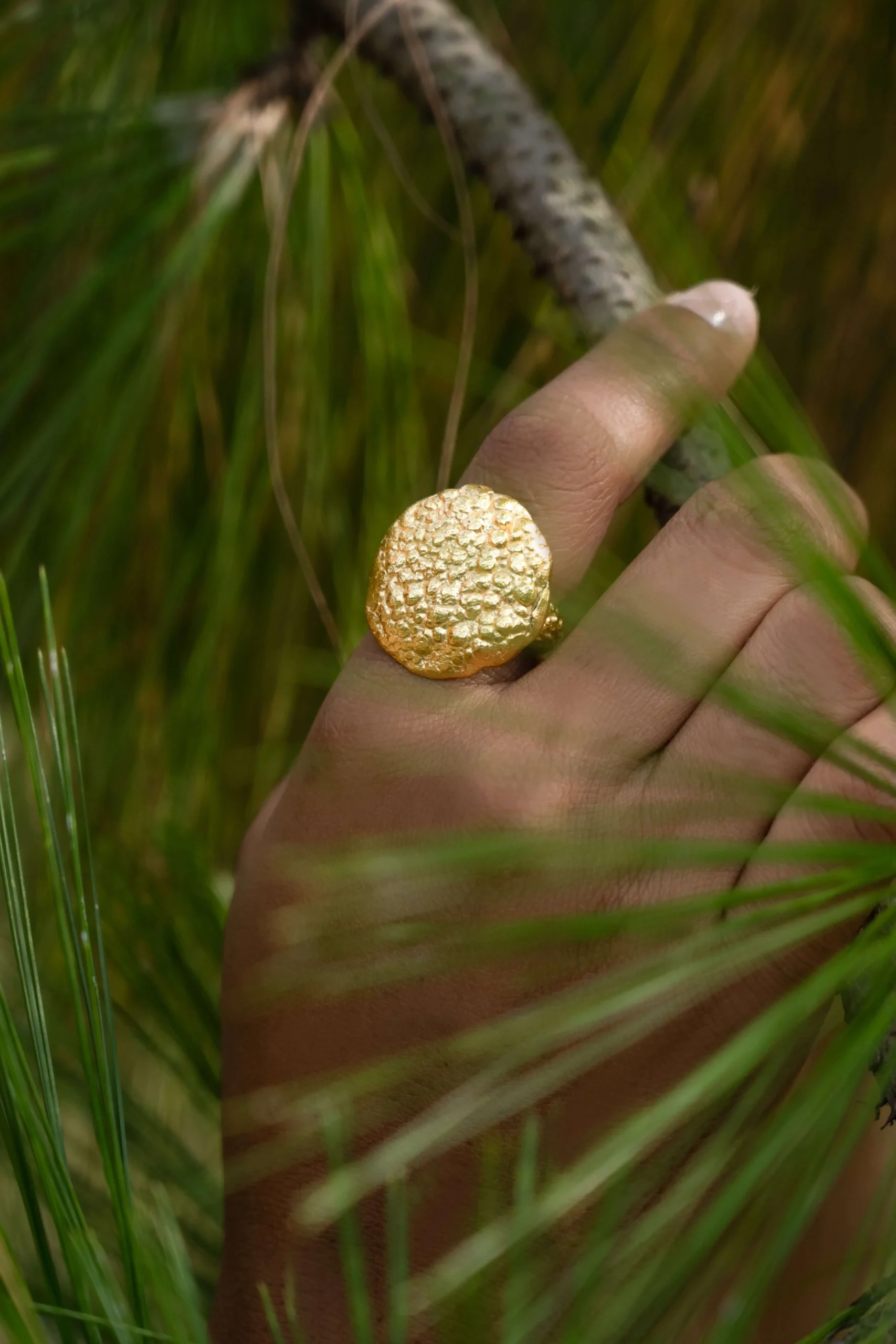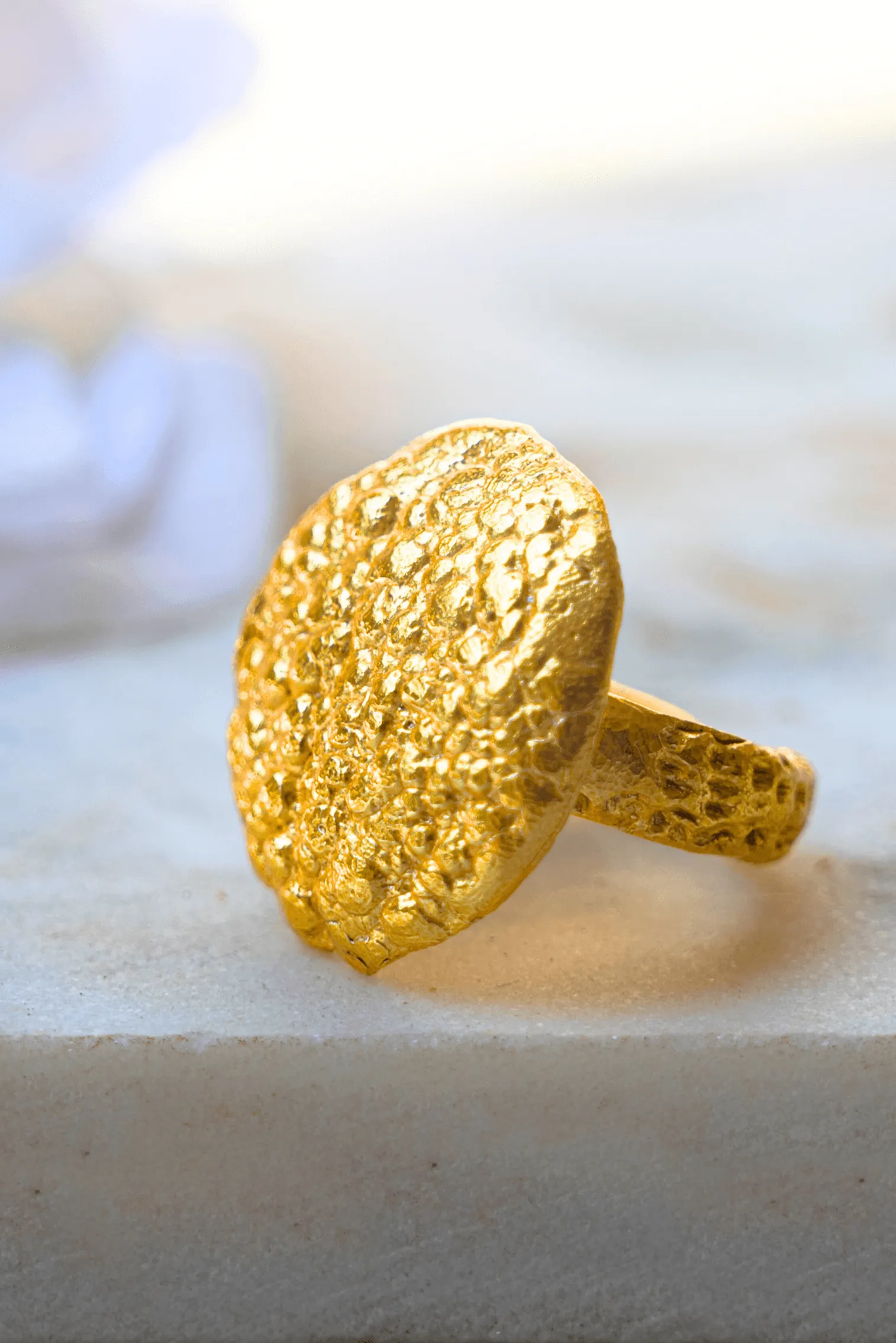 This shimmering in gold ring sits beautifully well on all fingers and can be used as a thumb ring. Made with the molten metal technique, this ring is truly unique.