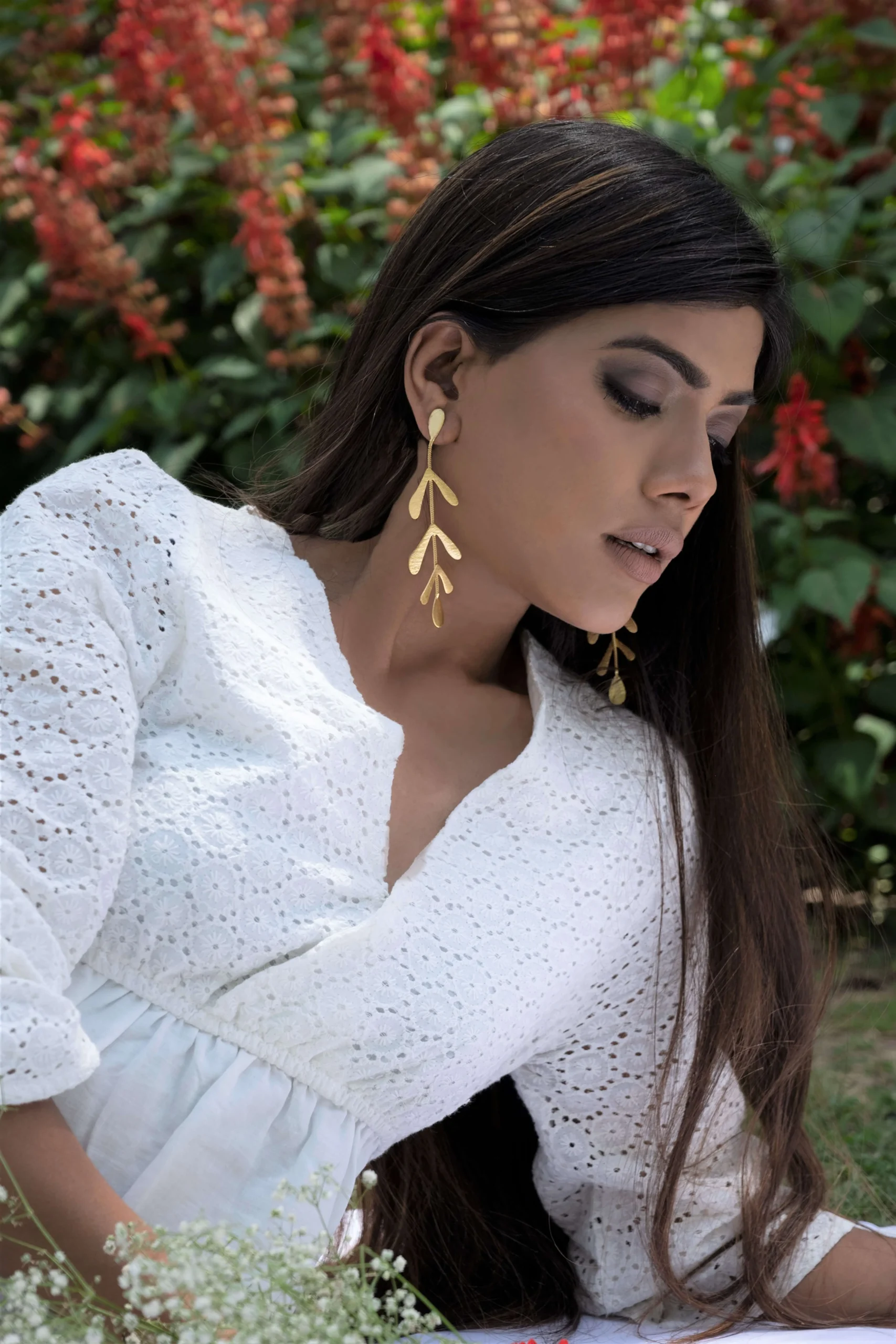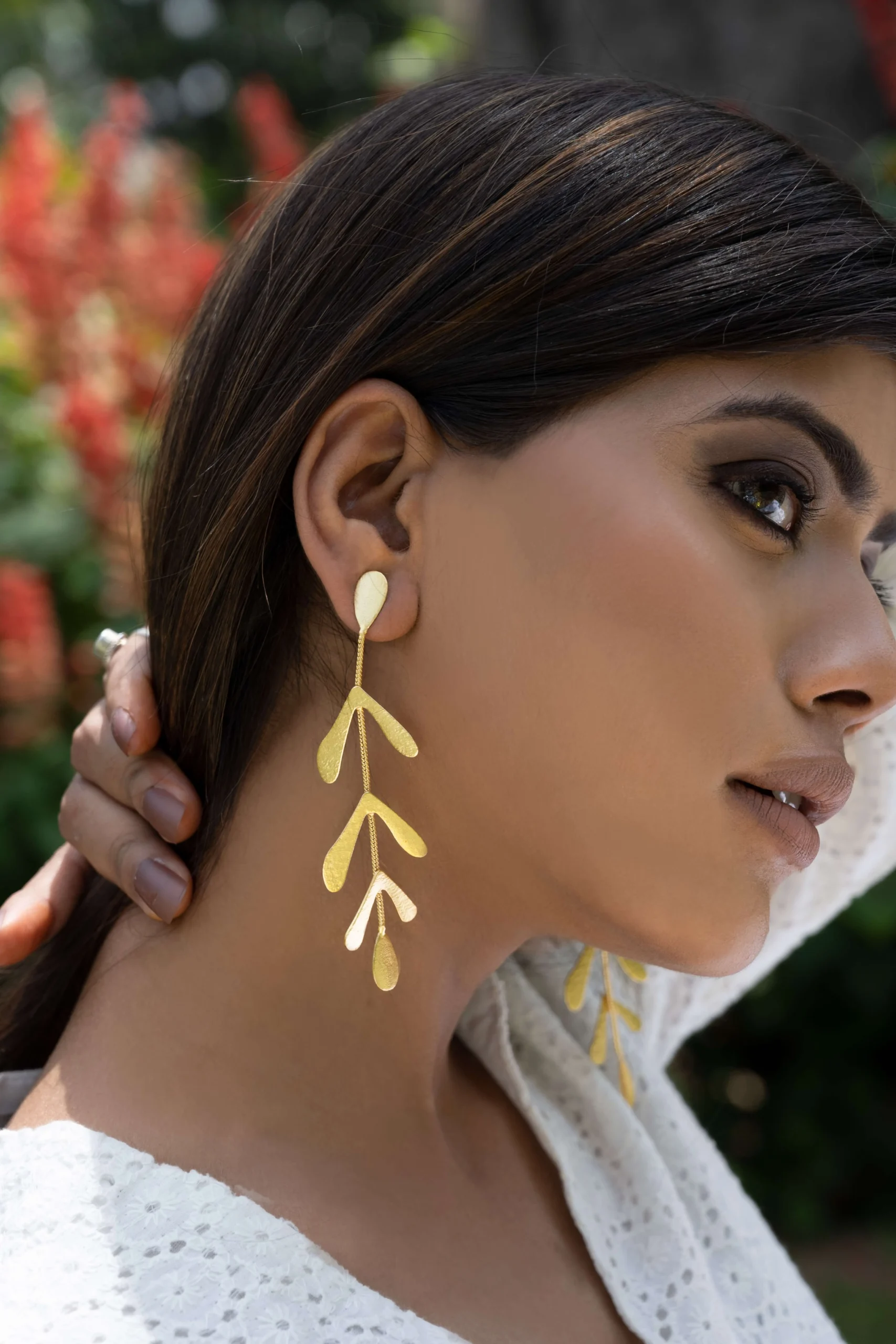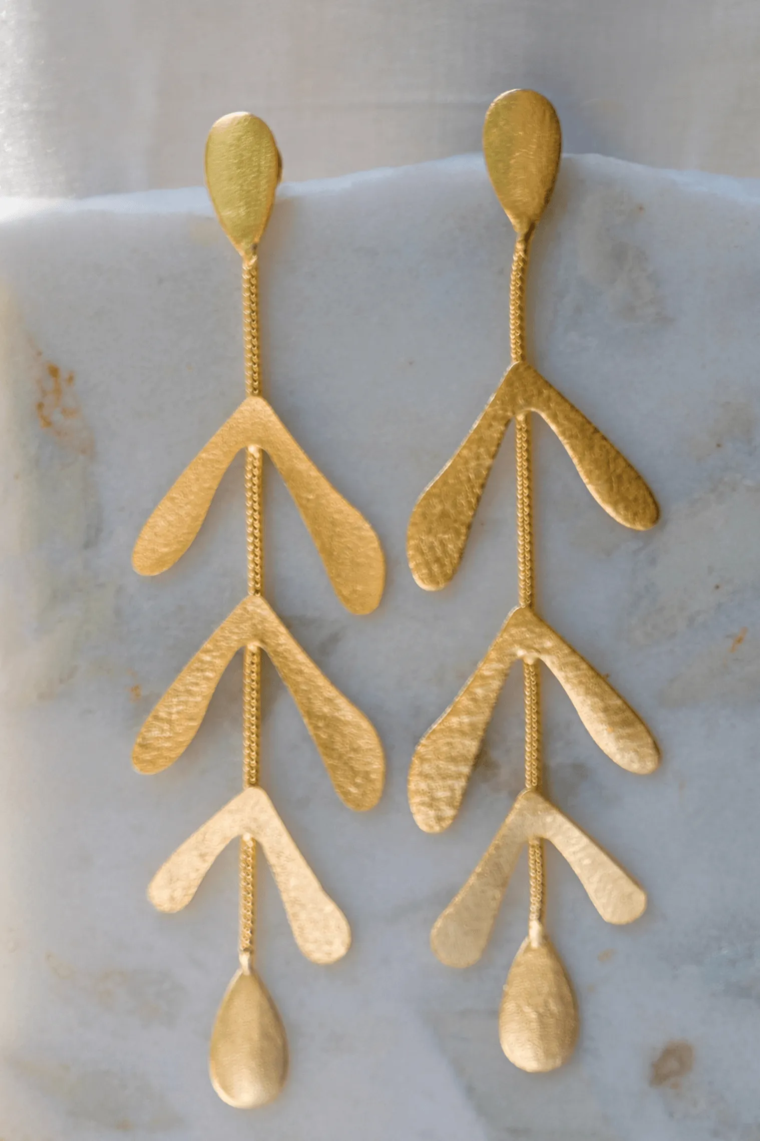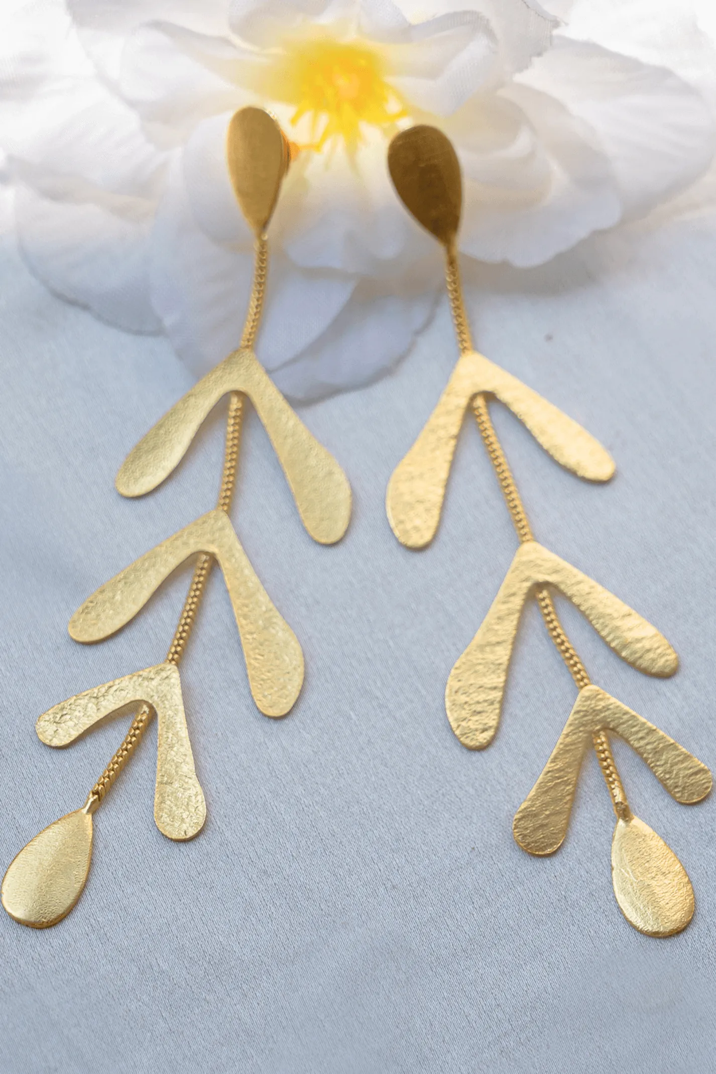 The delicate golden leaves cascading down creates a unique and elegant look that is perfect for casual wear or special occasions. These earrings are lightweight and comfortable. Pair them with a sleek updo or loose waves to really make a statement.